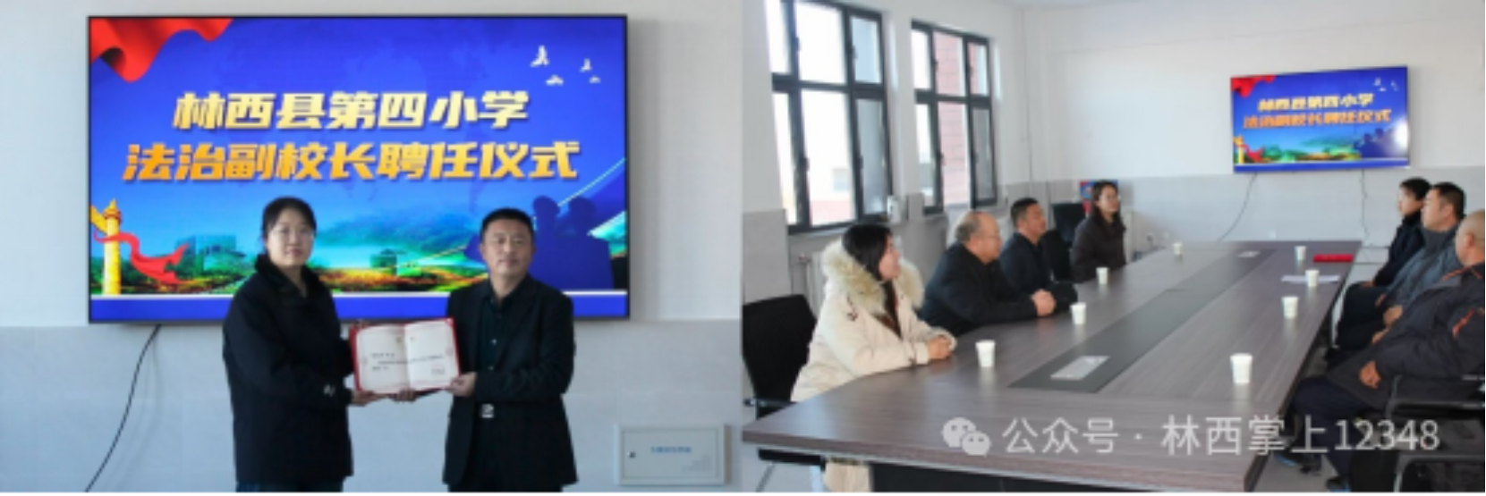 活动当天,聘任仪式在学校会议室正式举行。林西县第四小学校长王明新、副校长员艳丽、第四小学责任督学宋海明、责任督学王碧瑶、林西镇司法所所长郑国惠、内蒙古祥东律师事务所陈志东律师、林西镇司法所副所长李思言、市检察院基层锻炼定向选调生赵蕊共同见证这一重要时刻。仪式上,学校负责人为林西镇司法所副所长李思言同志颁发法治副校长聘任证书,聘请其担任该校法治副校长,聘期一年,并对其受邀担任学校法治副校长表示热烈欢迎和衷心感谢,共同助力学校构建平安法治校园,为学生的健康成长保驾护航。