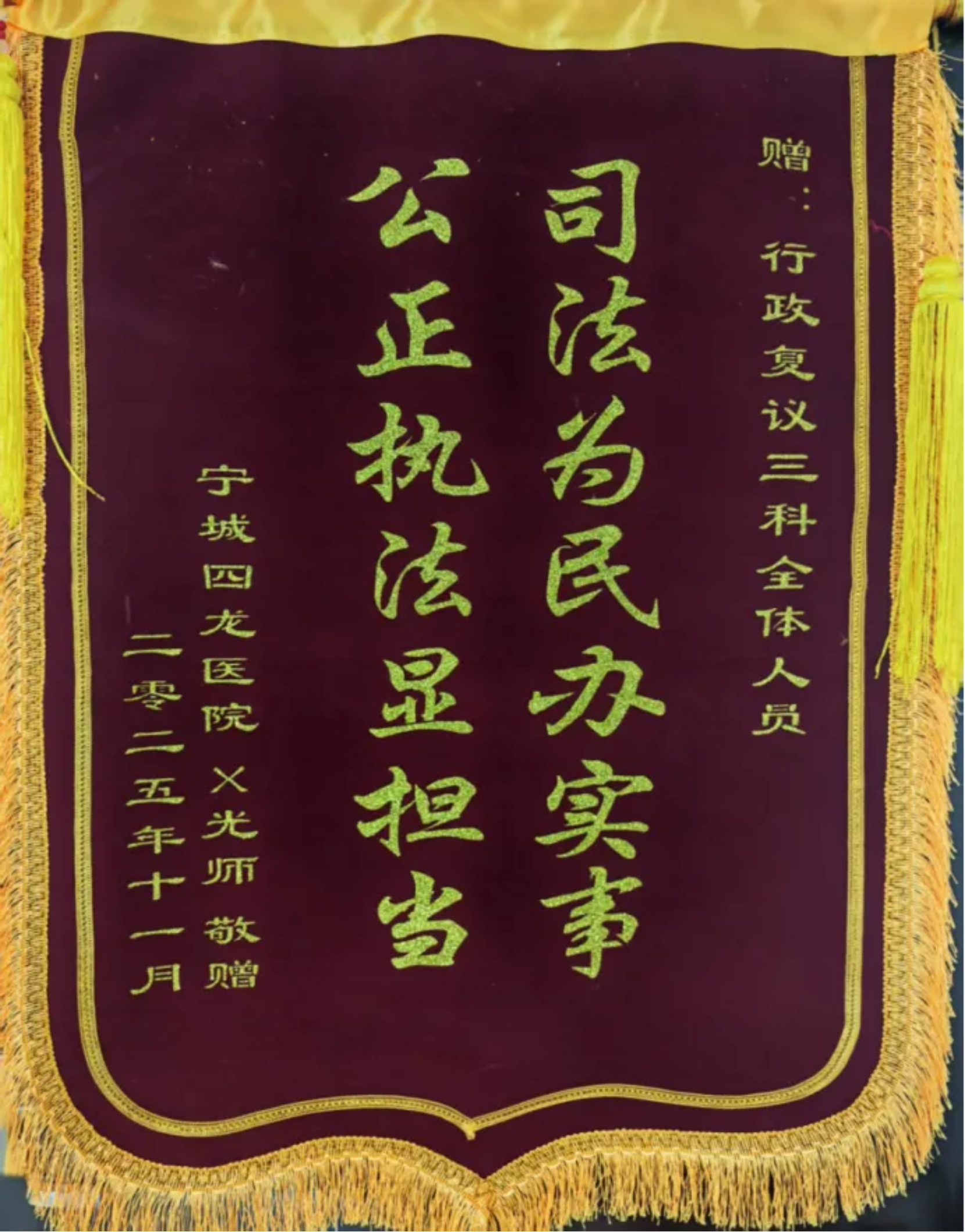 “谢谢行政复议的同志!不仅帮我们掘进队6个兄弟解决了认定难题,还为我的案子专门召开听证会,请专家论证,现在终于认可了我的特殊工种身份,压在心里的石头总算落地了!”近日,宁城县四龙医院X光师老李(化名)特意将一面印有“司法为民办实事 公正执法显担当”的锦旗和撤回复议申请书一同邮寄到行政复议三科,并打来电话致谢,言语间难掩激动。至此,这场涉及7名申请人、两类不同工种的特殊民生争议,在复议机关的“精准画像、分类施策”下画上圆满句号。
