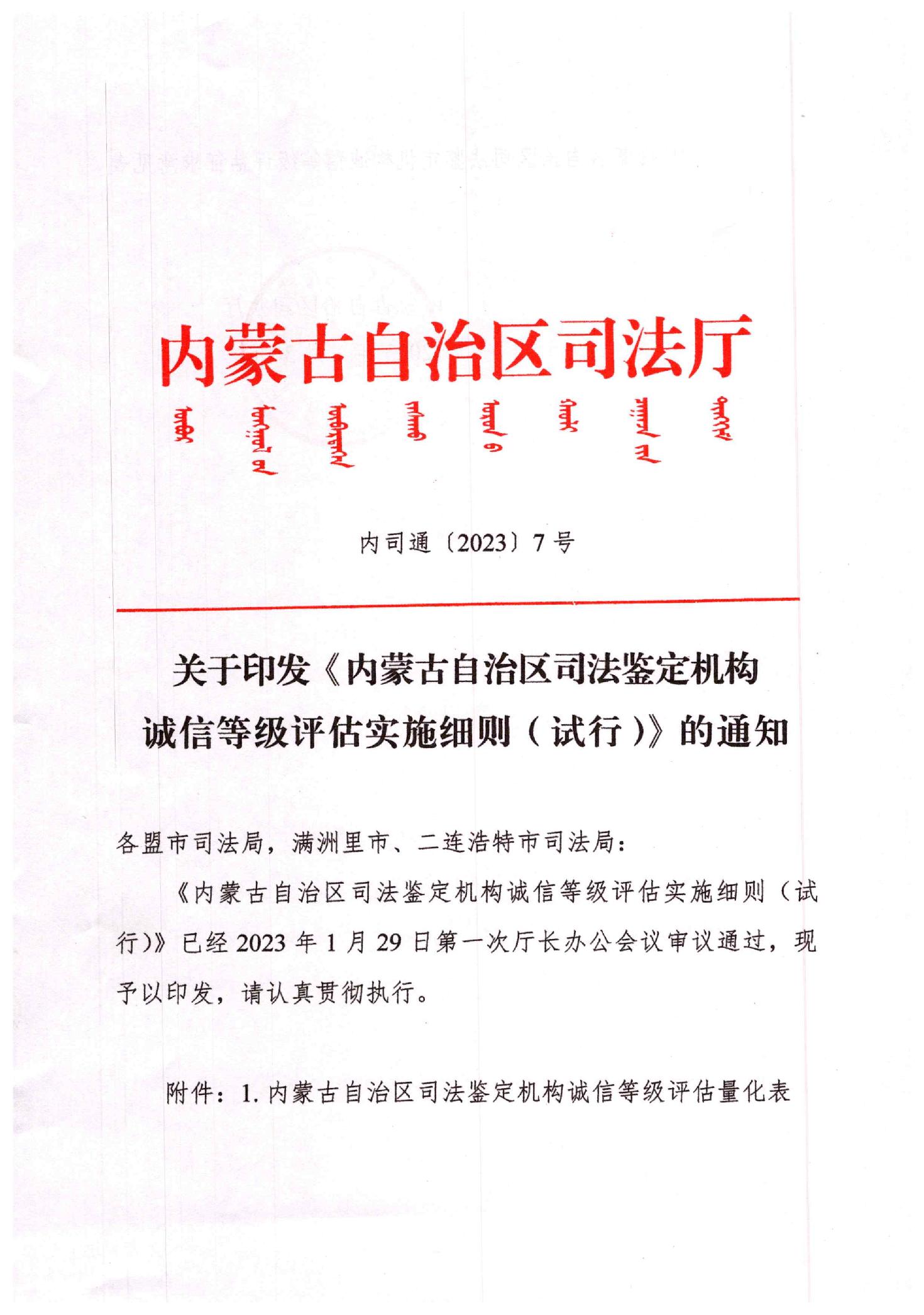 关于印发《内蒙古自治区司法鉴定机构诚信等级评估实施细则(试行)》的通知